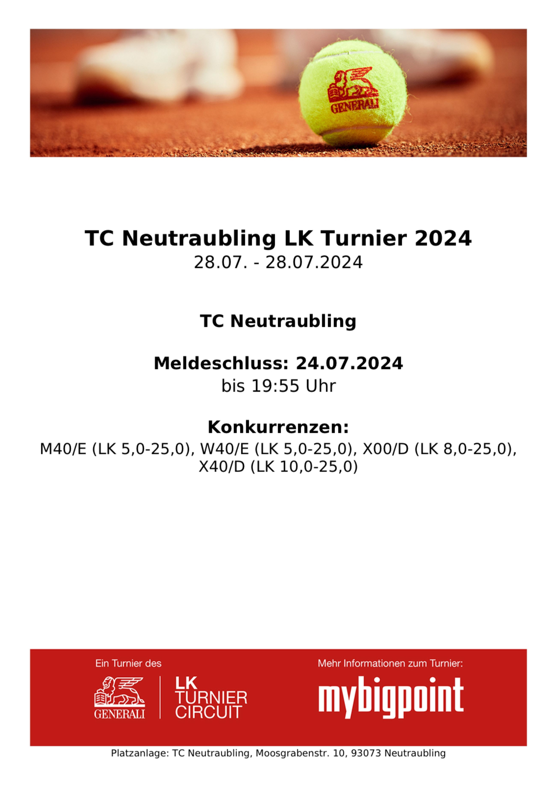 | Veranstaltungsort | Tennnisclub Neutraubling, Moosgrabenstraße 10, 93073 Neutraubling |